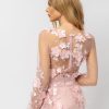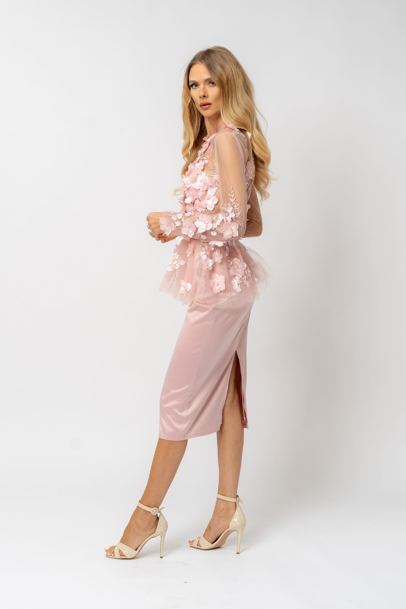 Partea superiora a rochiei este realizat din dantelă 3D iar fusta este confecționata din tafta elastica cu peplum din tull cu aplicatii din dantela 3D.